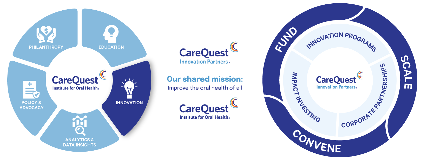 Joined by our mission to improve the oral health of all, CareQuest Innovation Partners is a for-profit subsidiary company of CareQuest Institute for Oral Health. A national nonprofit, CareQuest Institute for Oral Health is focused on creating a health care system that is designed for everyone — through its work in philanthropy, research, advocacy, and education, as well as leadership in dental benefits and innovation advancements.